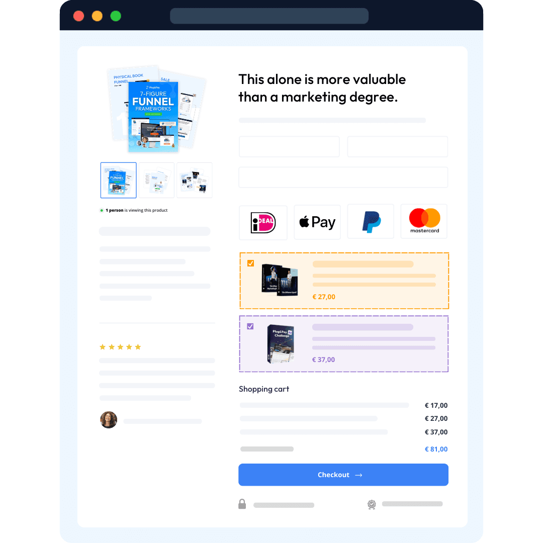 Maximise your revenue from every transaction by easily adding offers both before and after the moment of payment. You can add an order bump - a relatively cheap product offer right on the payment page - to increase the initial order value, and then, immediately after the purchase is complete, offer a one-click upsell that customers can accept instantly without re-entering their payment details.
