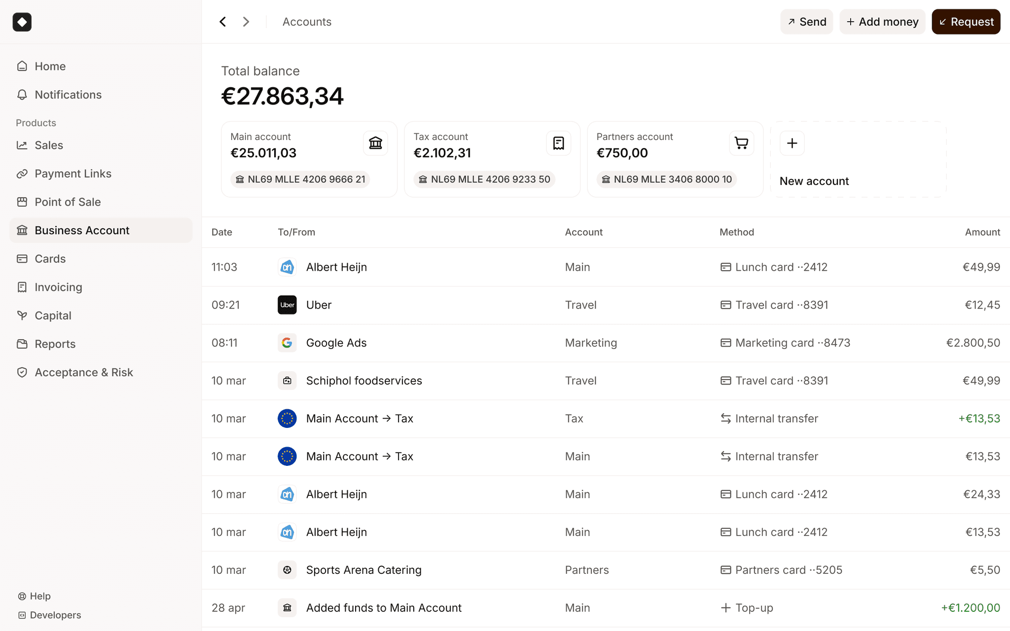 Mollie Business Accounts are free to use for the first 12 months, after which a charge of €9 per month will apply. The standard plan includes up to 10 accounts and 5 cards, with the option to add more. Learn more about Mollie pricing.